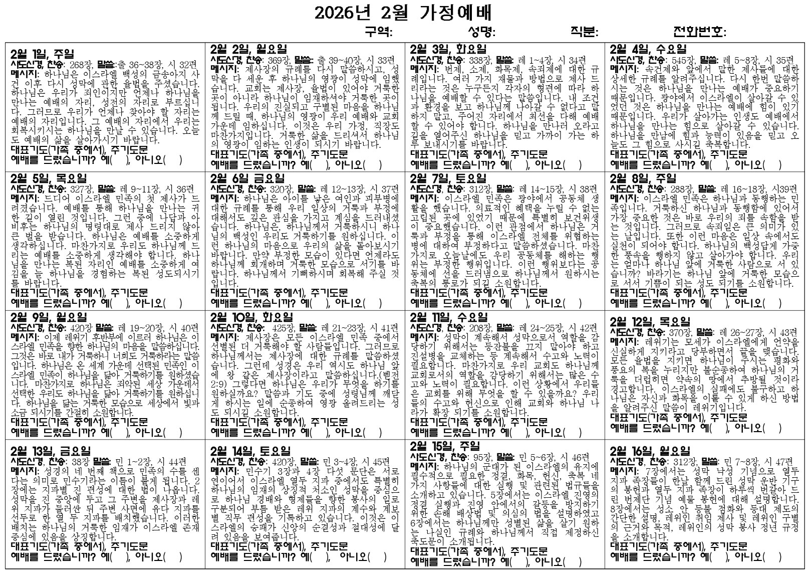 2026년 2월 가정예배순서지 장석교회 0 01.25 10:01 2026.01.25 10:01 2월 가정예배.hwp (199.0K) + 3 2026.01.25 10:01 2월 가정예배.pdf (197.2K) + 2