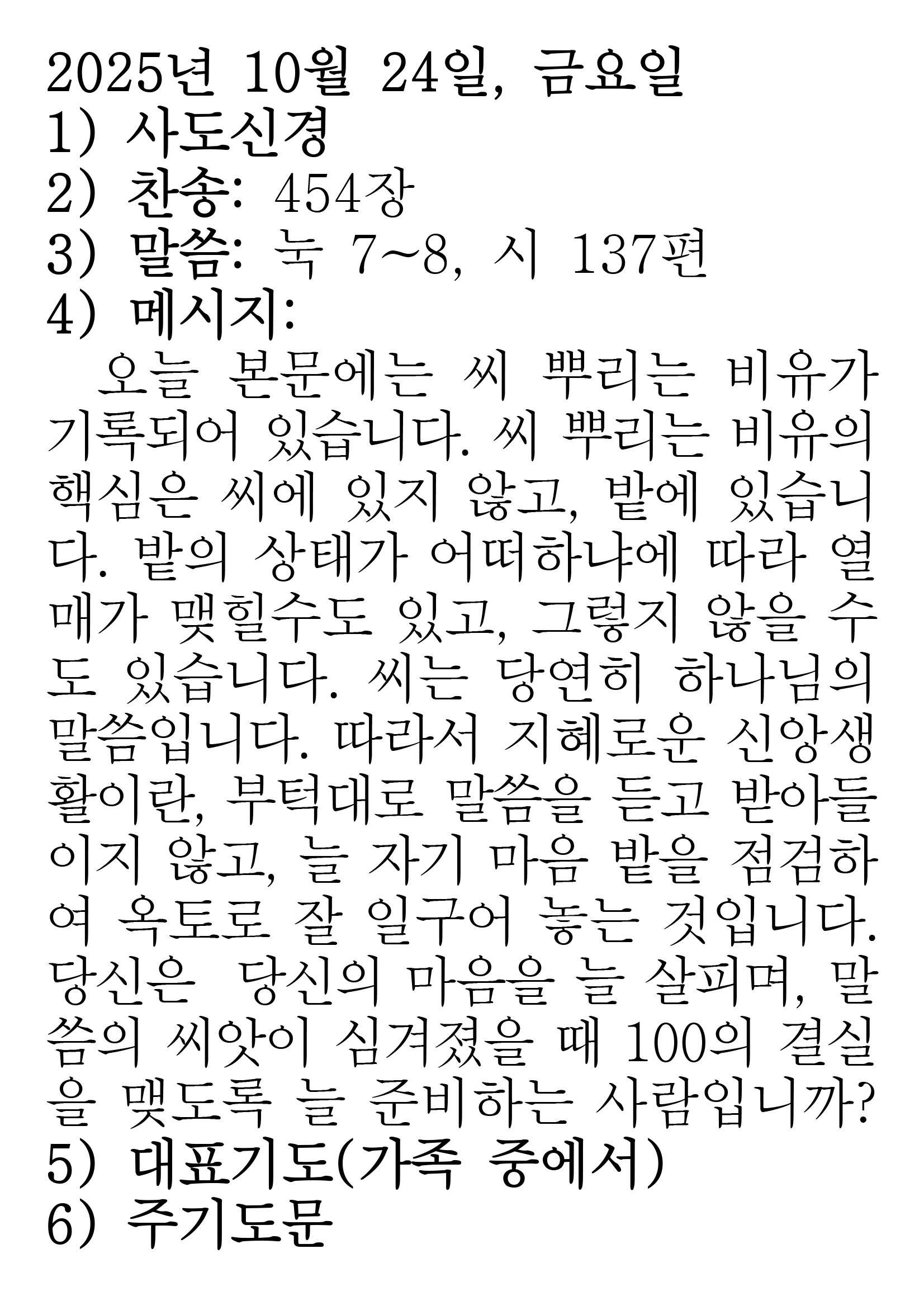 2025.10.24 (누가복음 7-8 시편 137편) 장석교회 0 2025.10.23 23:06 https://www.youtube.com/watch?v=Y5cYaU6GQD4 + 0