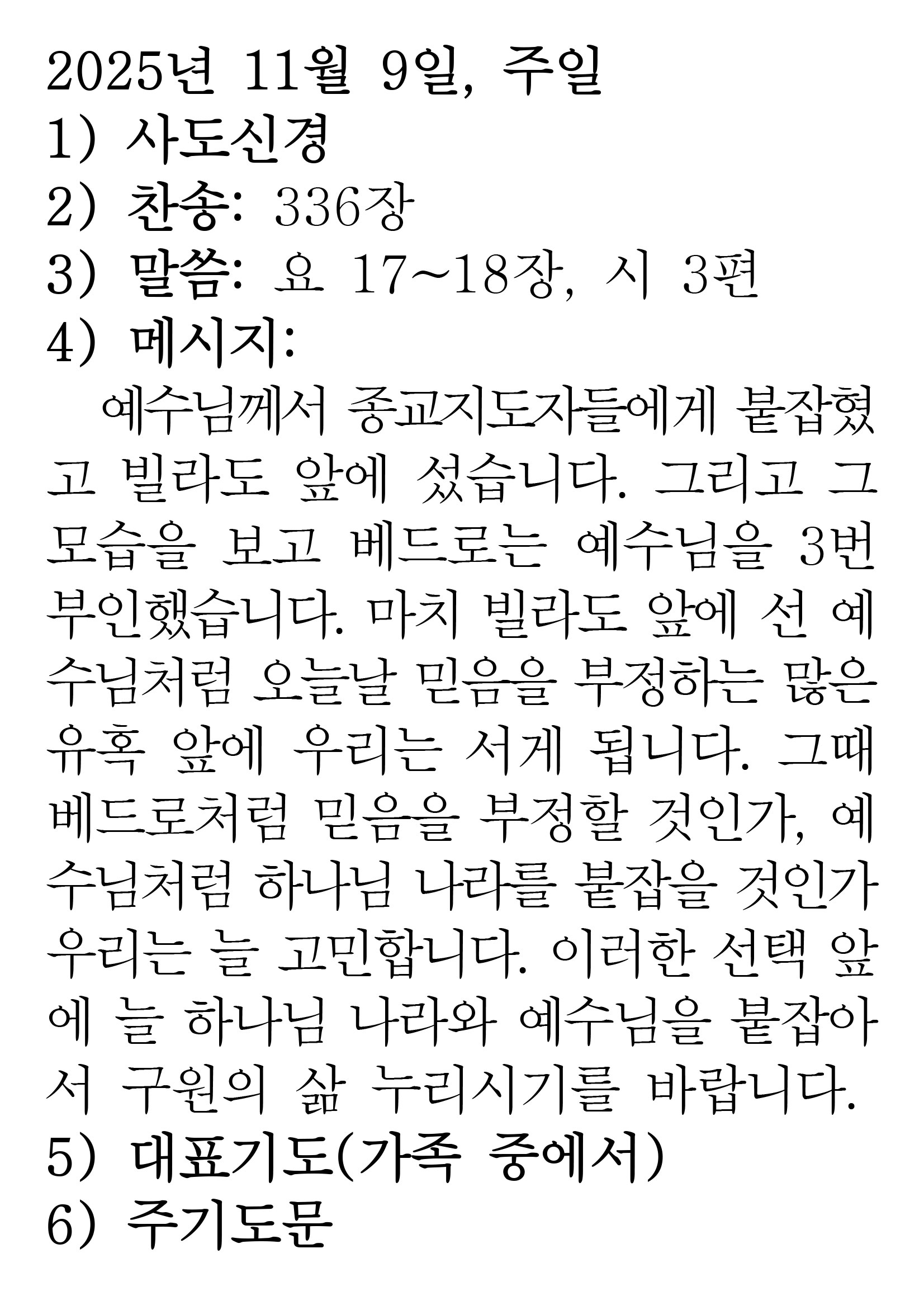 2025.11.09 (요한복음 17-18 시편 3편) 장석교회 0 2025.11.09 00:10 https://www.youtube.com/watch?v=dIBX8jFLgyo + 0
