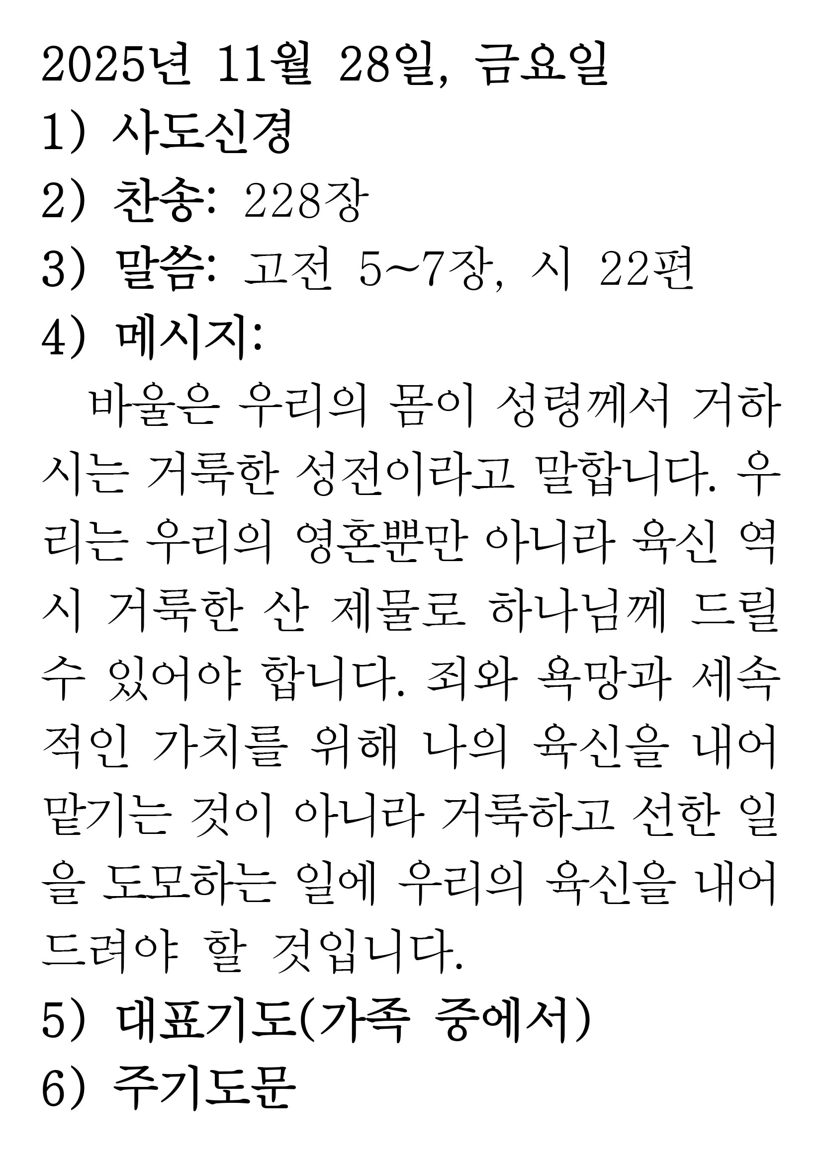 2025.11.28 (고린도전서 5-7 시편 22편) 장석교회 0 2025.11.28 01:55 https://www.youtube.com/watch?v=wll_DZQXX5c + 0