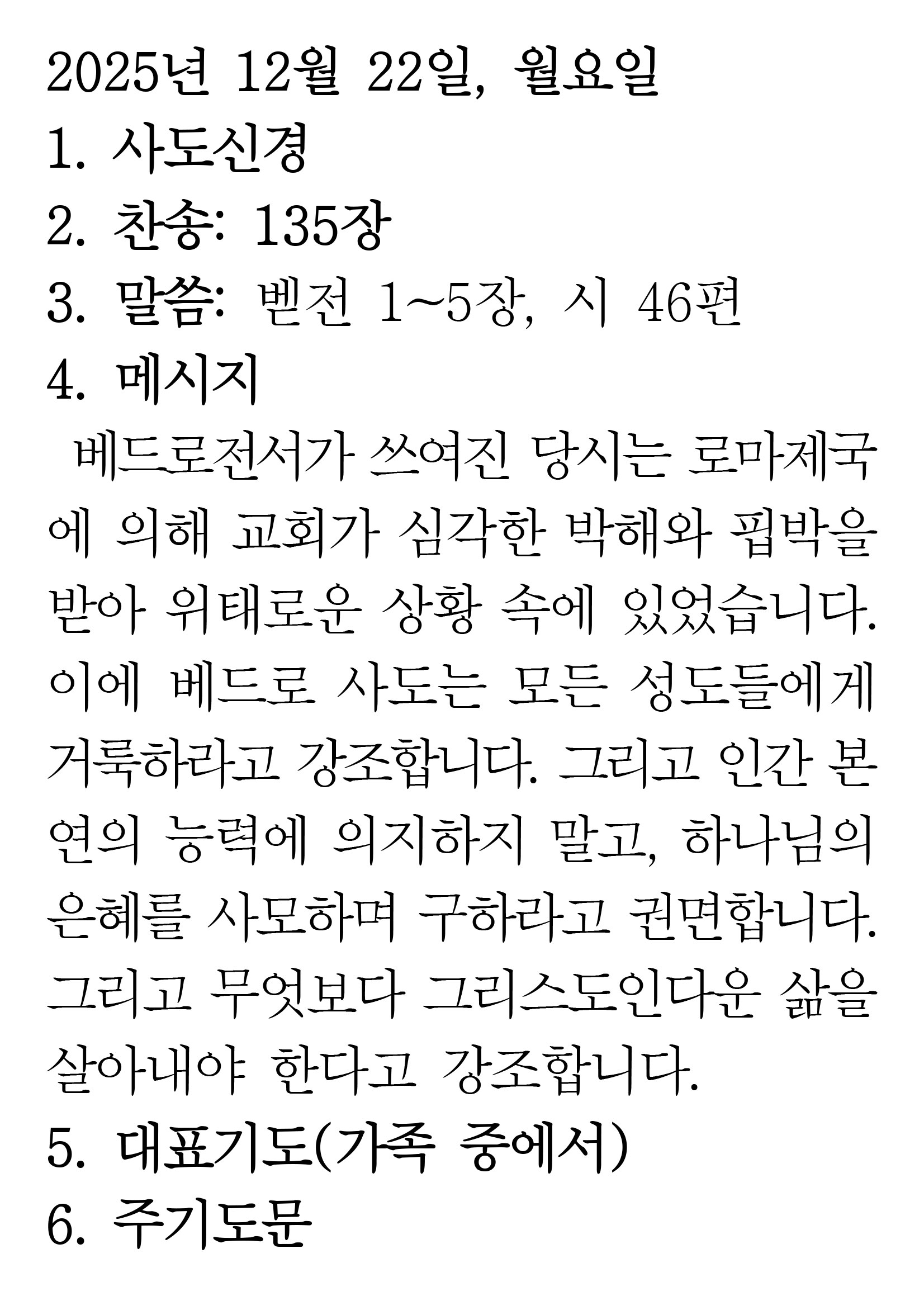 2025.12.22 (베드로전서 1-5 시편 46편) 장석교회 0 2025.12.21 22:30 https://www.youtube.com/watch?v=1GxKXPlGBVI + 0