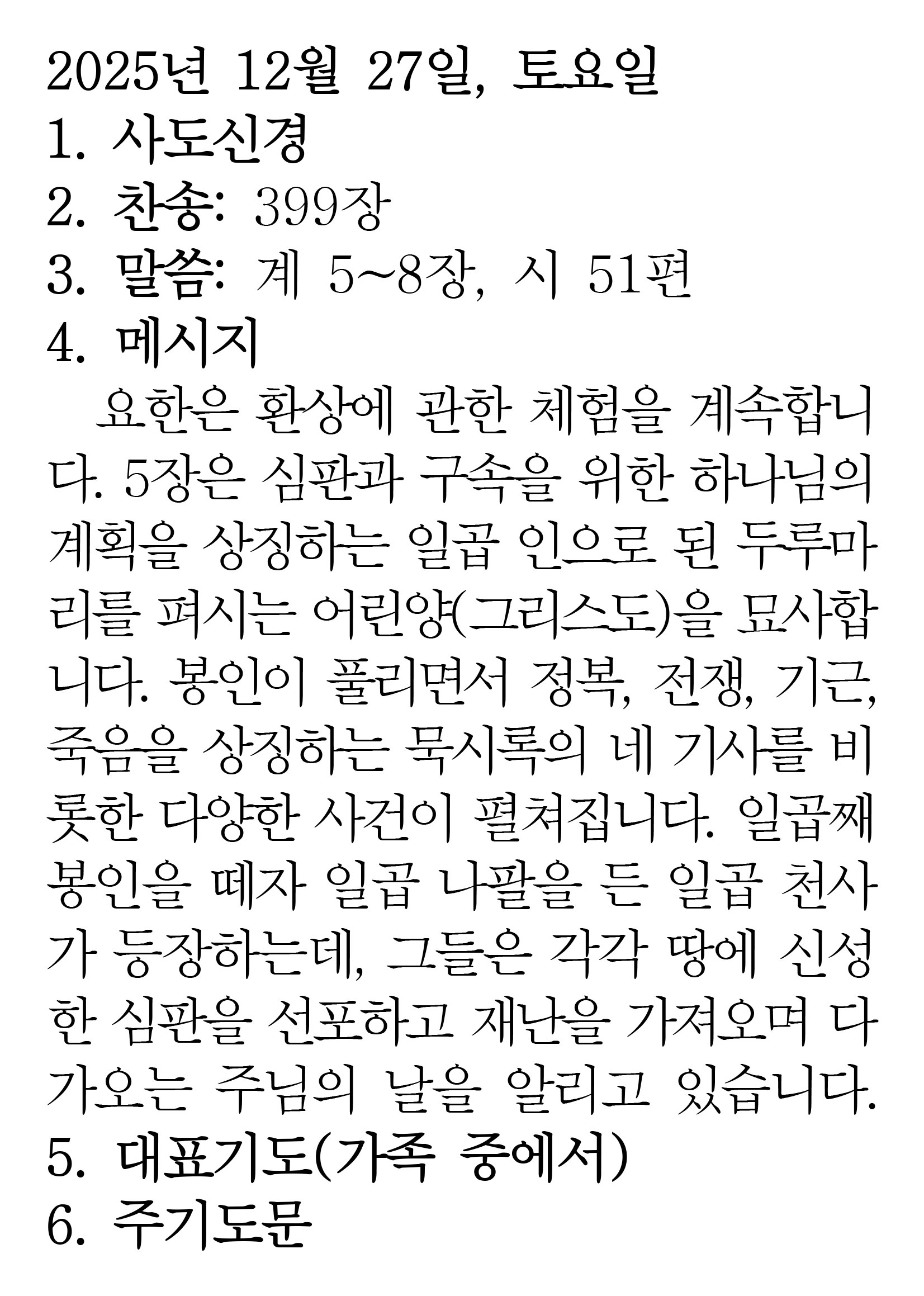 2025.12.27 (요한계시록 5-8 시편 51편) 장석교회 0 2025.12.26 22:46 https://www.youtube.com/watch?v=R9Wgnw7kgE8 + 0