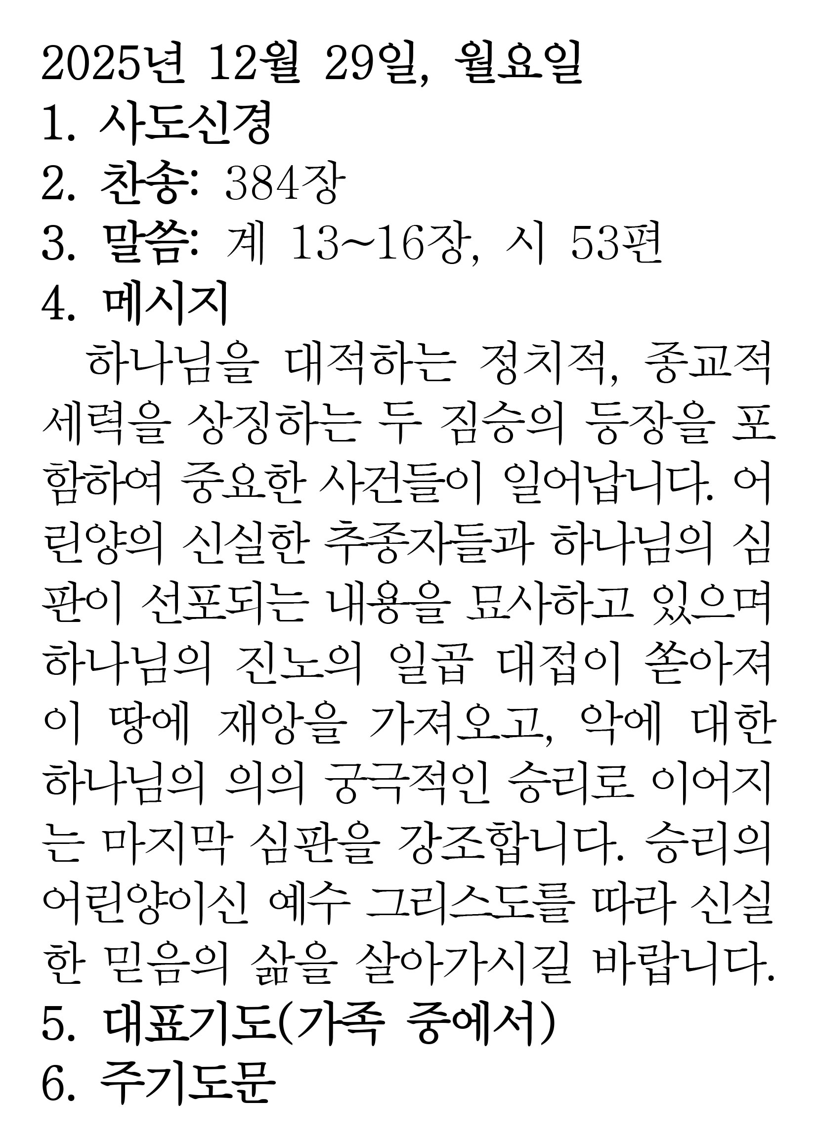2025.12.29 (요한계시록 13-16 시편 53편) 장석교회 0 2025.12.28 23:13 https://www.youtube.com/watch?v=kbcx6bHZwAE + 0
