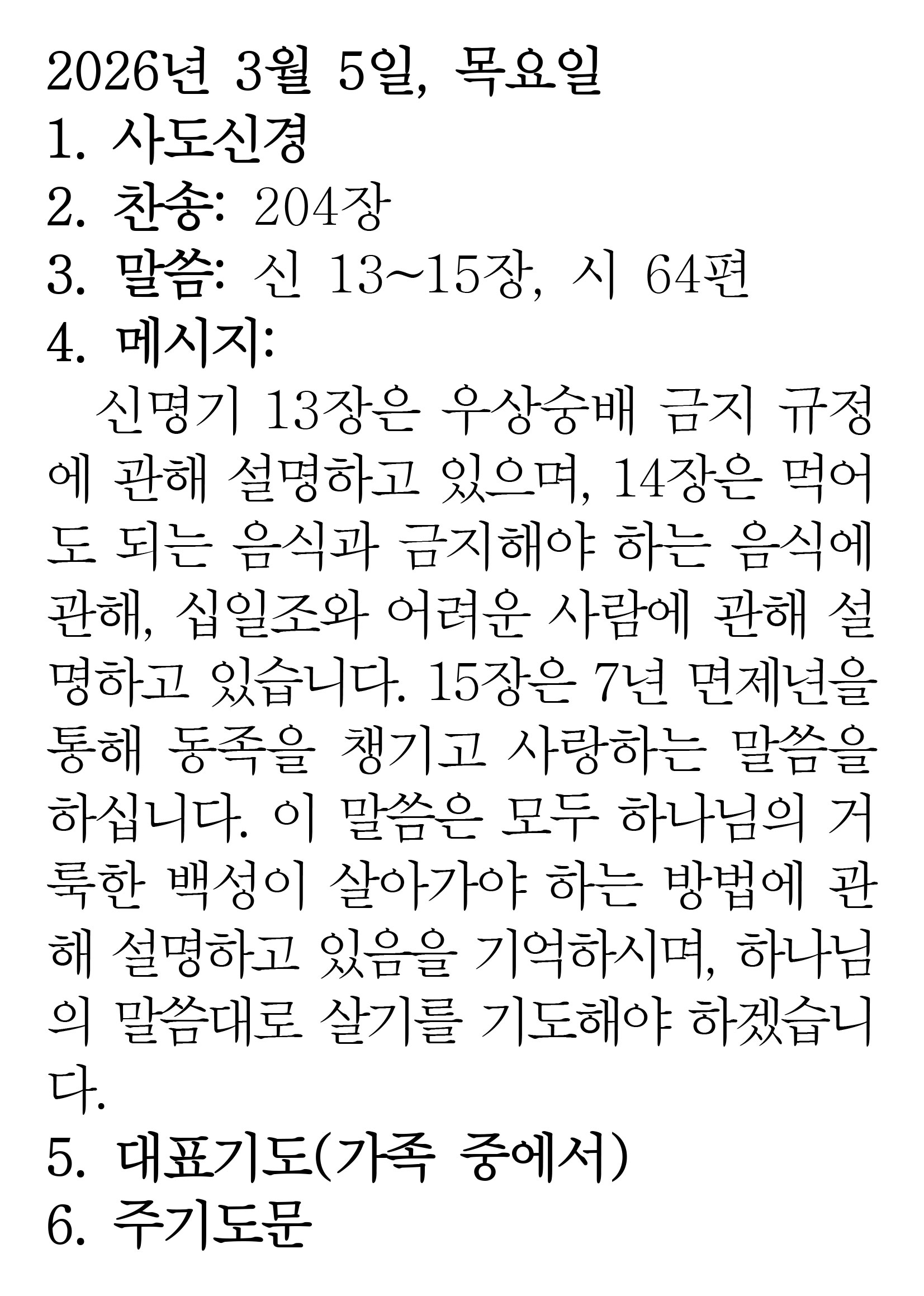 2026.3.5 (신명기 13-15 시편 64편) 장석교회 0 03.04 23:41 https://www.youtube.com/watch?v=_uRo8eB7zWQ&list=PLR8YZyi4tITL4u0I_8Br… + 0