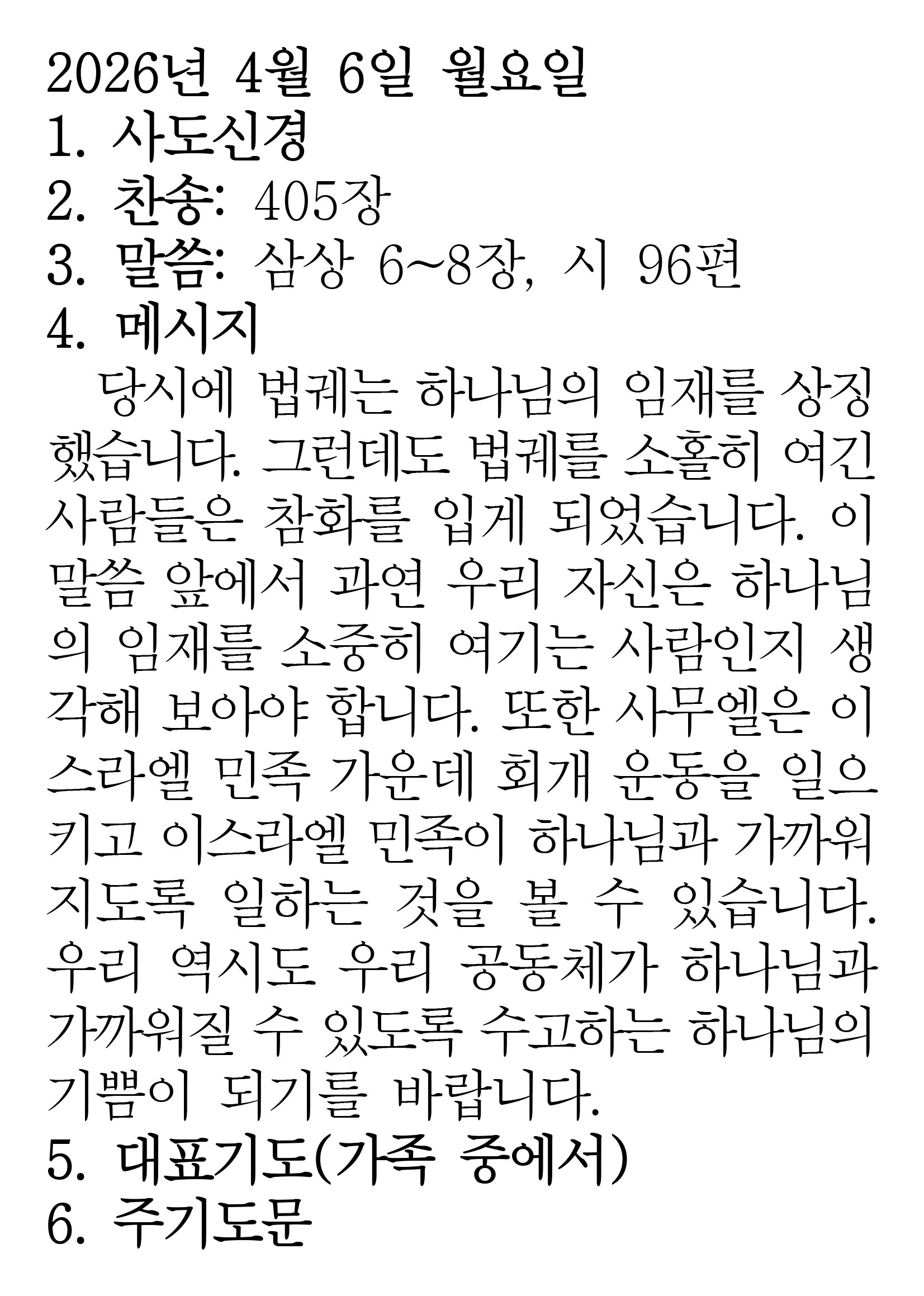 2026.4.6 (사무엘상 6-8 시편 96편) 장석교회 0 04.05 22:53 https://www.youtube.com/watch?v=96HD91abcK0&list=PLR8YZyi4tITKVkdUpDWF… + 0