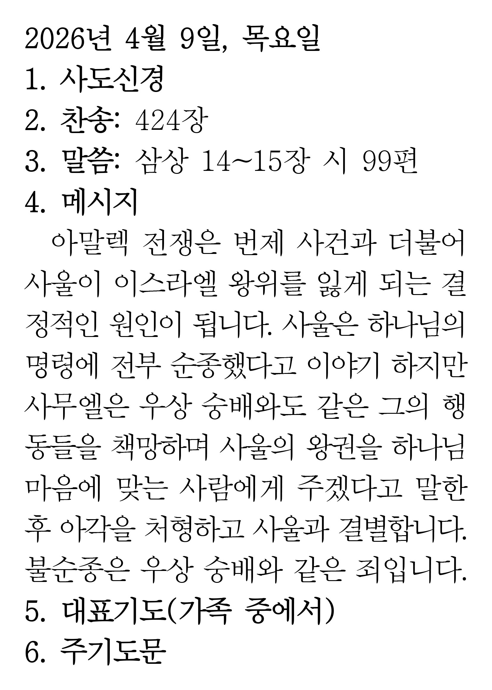 2026.4.9 (사무엘상 14-15 시편 99편) 장석교회 0 04.08 23:34 https://www.youtube.com/watch?v=NdxxUneqU6E&list=PLR8YZyi4tITKVkdUpDWF… + 0