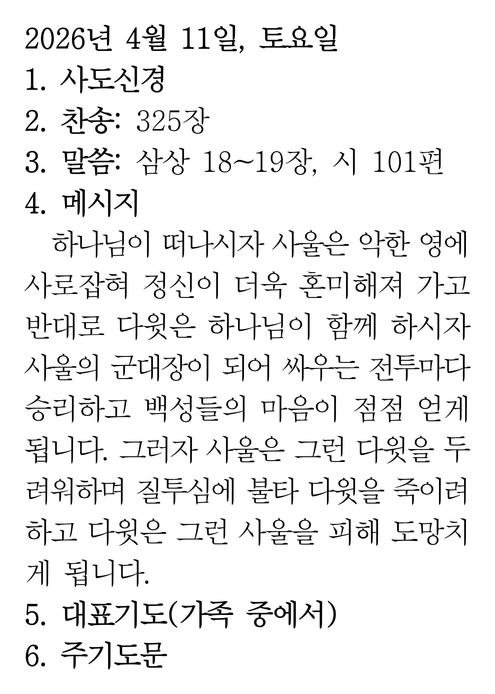 2026.4.11 (사무엘상 18-19 시편 101편) 장석교회 0 04.10 23:24 https://www.youtube.com/watch?v=JAsjwXvG8A0&list=PLR8YZyi4tITKVkdUpDWF… + 0