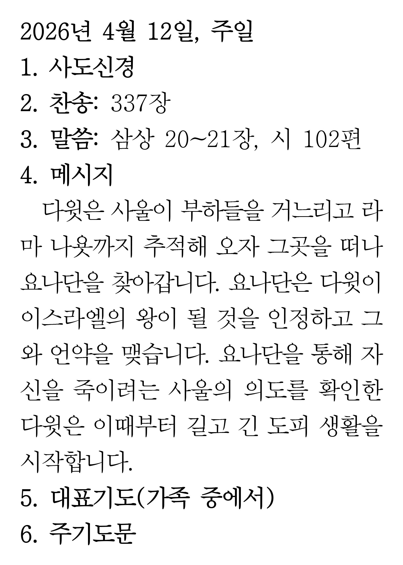 2026.4.12 (사무엘상 20-21 시편 102편) 장석교회 0 04.11 21:45 https://www.youtube.com/watch?v=Vi1TVD-ERPM&list=PLR8YZyi4tITKVkdUpDWF… + 0