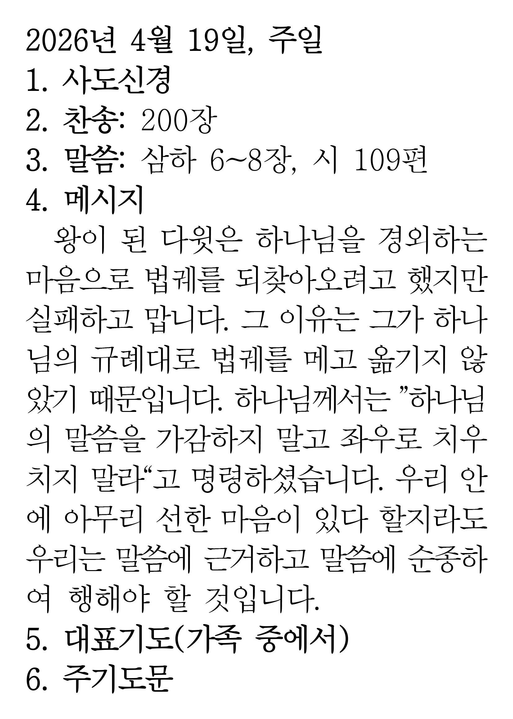 2026.4.19 (사무엘하 6-8 시편 109편) 장석교회 0 3시간전 https://www.youtube.com/watch?v=fe1Bd50qukw&list=PLR8YZyi4tITKVkdUpDWF… + 0